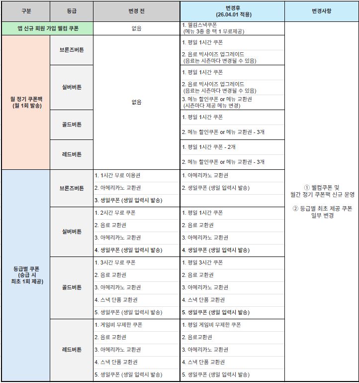 함께하는 즐거움을 드리는 보드게임카페 레드버튼입니다. 항상 저희 보드게임카페 레드버튼을 찾아주시는 고객님께 진심으로 감사드립니다. 레드버튼 고객님들께 더 풍성한 혜택과 즐거움을 제공하기 위해 2026년 4월 1일부로 레드버튼 멤버십 혜택이 새롭게 개편됩니다. ![]() ※ 등급 별 포인트 적립율에는 변동 없습니다. ※ 26년 3월 31일 이전 승급 시 지급된 기존 쿠폰은 그대로 유지됩니다. ※ 26년 4월 1일 이후 승급 회원에게는 개편된 등급 쿠폰이 지급됩니다. ※ 등급 쿠폰은 승급 시 최초 1회 제공됩니다. ※ 멤버십 쿠폰은 중복 사용이 불가합니다. (단 일부 이벤트/프로모션 쿠폰은 중복 사용이 가능할 수 있으며, 자세한 사항은 각 쿠폰의 안내 내용을 확인해 주세요.) ※ 쿠폰별 유효기간이 상이하므로, 발급된 쿠폰의 상세 안내를 꼭 확인해 주세요. 앞으로도 고객님들께 더욱 다채롭고 특별한 즐거움을 드리는 레드버튼이 되겠습니다. 감사합니다. |